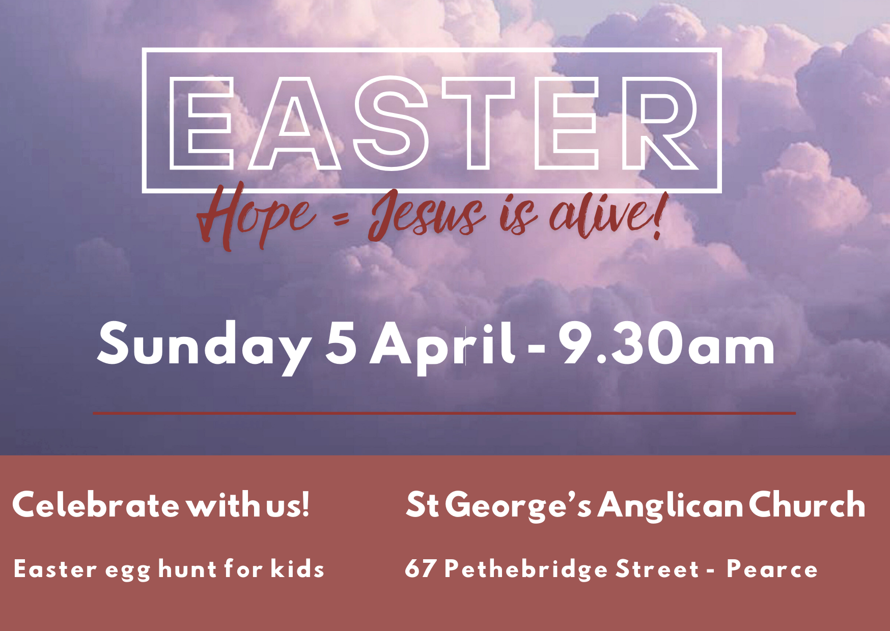 You are warmly invited to join us this Easter! Whether you are thinking of returning to Church, new to Canberra, curious about what Christian believe, want to learn more about Jesus or your Children are asking questions you aren’t confident to answer, this Sunday is for you! There will be singing, a talk from the Bible about Hope that knowing Jesus brings, prayer for our troubled world, a Kids talk, Egg hunt for kids plus food and drinks.